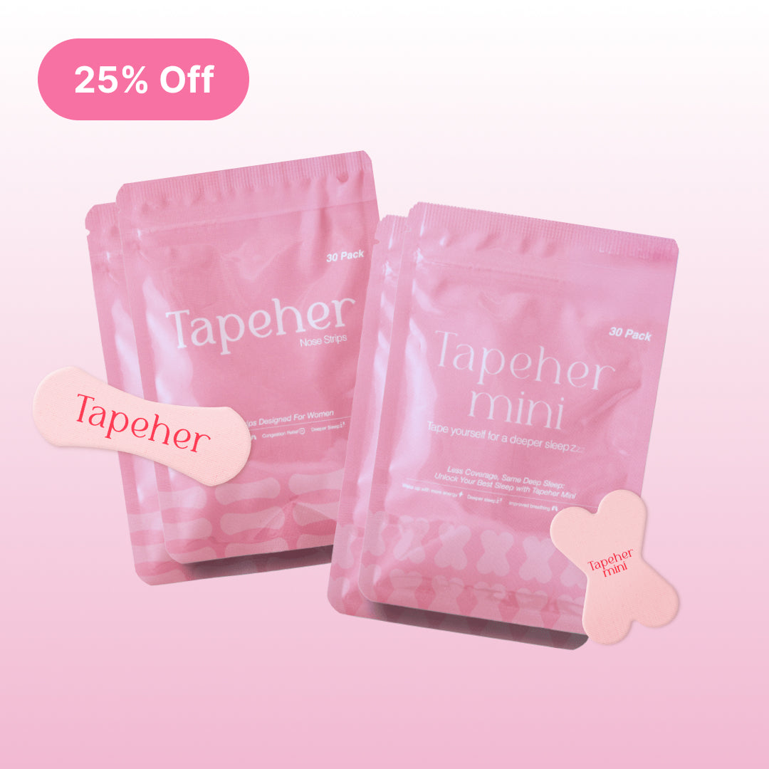 This bundle includes 2 packs of Tapeher Mini Mouth Tape and 2 packs of Tapeher Nose Strips - your complete, all-natural sleep solution. Designed to help you breathe better, sleep deeper, and wake up more refreshed, every single day.