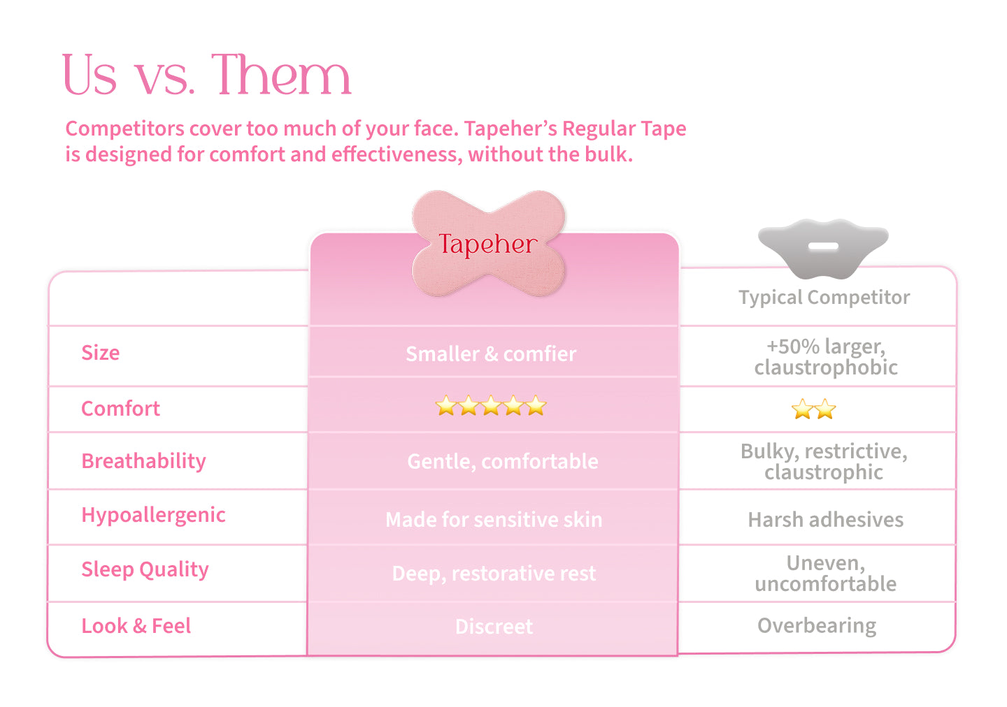 Most mouth tapes feel bulky and claustrophobic. Tapeher is 50% smaller, delivering all the benefits with none of the discomfort.
