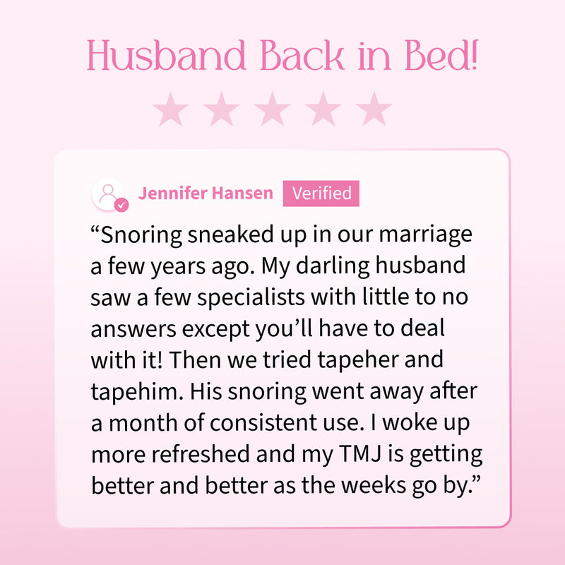 My snoring is gone, my sleep is deeper, and I wake up feeling like a new person. Tapeher truly changed my nights." - Lauren R